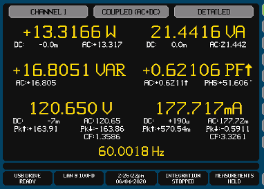 Figure 2. A power analyzer’s power data screen shows key lighting parameters.