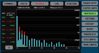 Figure 4. A power analyzer showing the specification for EN61000 (Class A) for harmonics testing.