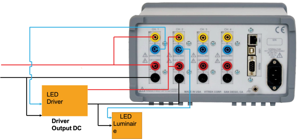 For LED driver efficiency testing, a power analyzer can be hooked up to an LED luminaire to make sure the product meets specifications for compliance. As shown in Figure 3, the back panel of the power analyzer shows two of the channels. On the LED driver side, the input to the LED driver is a 120V AC input signal and output is a DC signal (typically around 10 volts.) Also illustrated is how the 120V input power (the red and black wires) is routed and connected as channel 1 for voltage.