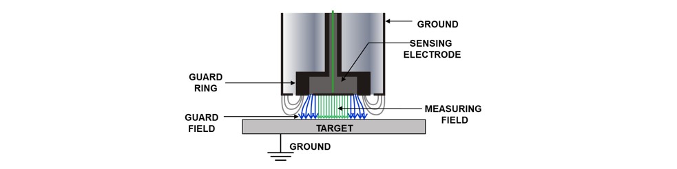 Capacitive probes use electric fields to measure the distance from the sensor face to the target surface. A guard ring around the capacitive sensor in the probe steers the direction of sensing. This steering is practically straight through to the target and ignores nearby influences of adjacent surfaces that might disrupt the reading.