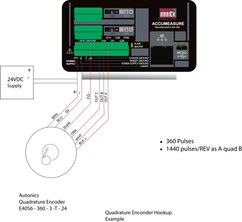 It is a 360-count index encoder with quadrature output resulting in 1440 quadrature counts per revolution. The Z index pulse from the encoder resets the counter in the D400 back to 0. The encoder is connected to the Accumeasure as shown in Figure 7. (Reference MTI’s app note https://demo.vitrek.com/applications/connecting-encoders-to-mti-digital-accumeasure/for more information on using quadrature encoders.)