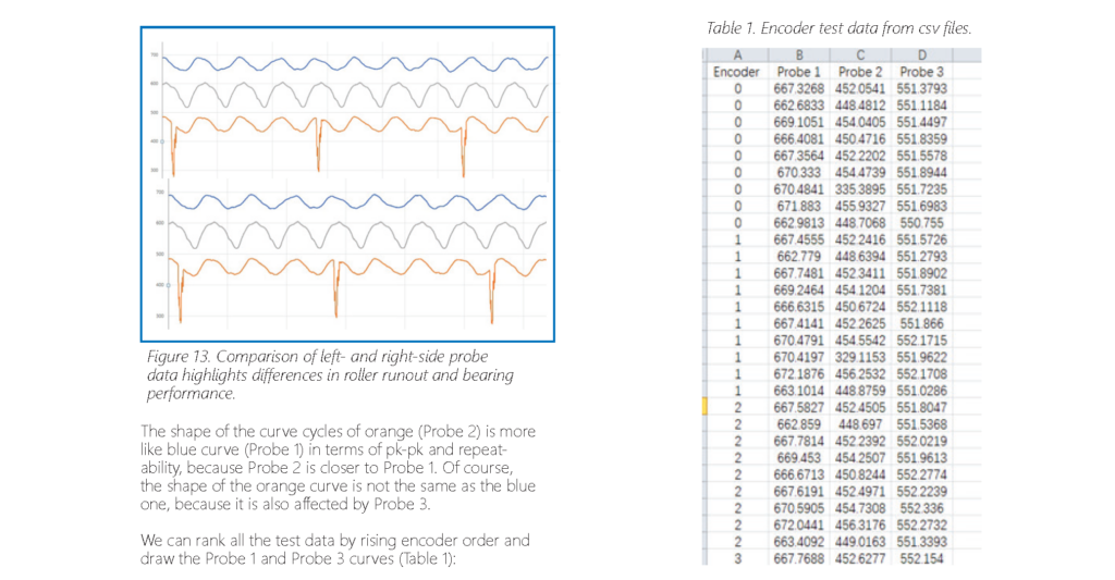 Foil Thickness Using Three Probes To Also Account for Roller Tilt. Using three capacitive probes to characterize roller run out, and tilt is more difficult but in theory should provide a more accurate foil thickness. The calculations below are intended to provide an explanation and guideline on using the three probe method. From Figure 13, we can see the pk-pk of blue curve (Probe 1) is smaller than one of the gray curve (Probe 3). This means the runout of left side (Probe 1) is smaller than the right side (Probe 3). The repeatability of the blue curve cycles is worse than the repeatability of the gray curve cycles. This means the bearing of left side is worse than the right side.