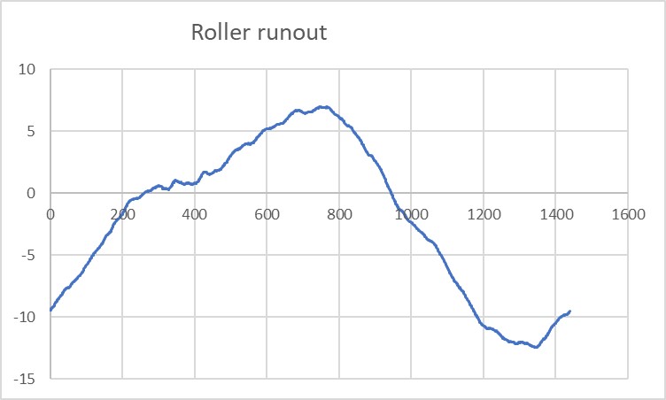 We want to measure the step height of the copper foil on the roller but the run out of the roller will influence that. Rollers are not perfectly round, and they may have bearing wobble too. If we record the run out of the roller by measuring the difference between probe 1 and 2 (without foil) for a 360-degree revolution (1440 encoder counts) we can generate an error file that could be subtracted off the step height readings to correct for roller run out. While this isn’t perfect it should get us down to less than a couple of microns of error.