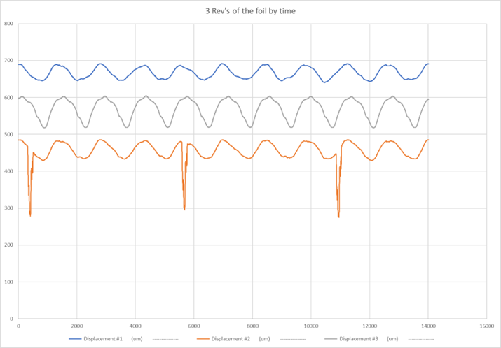 Next, we place the foil on the test rig and collect data in monitor mode. In this case we taped the foil together so we will see a big spike in the data where the foil has been joined. Figure 10 is the displacement of the three probes. Note: EV battery foil is similar to copper foil in that it is conductive and could be used, but the graphite composite material was found to not be durable enough for endless loop testing. Eventually the graphite flakes off after handling and multiple  rotations.