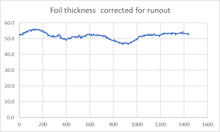 The third probe in the sketch was planned for further testing was needed to see if we can get rid of the asynchronous error. In this case and with further computations it did not seem to help but in some cases where really bad bearing runout occurs it may help. The final foil thickness plot for a single revolution of the measurement roller is shown in Fig 12.