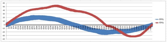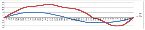 Figure 15a. The average of Probe 1 (blue curve) and of Probe 3 (red curve) from encoder positions 0 to 1439.