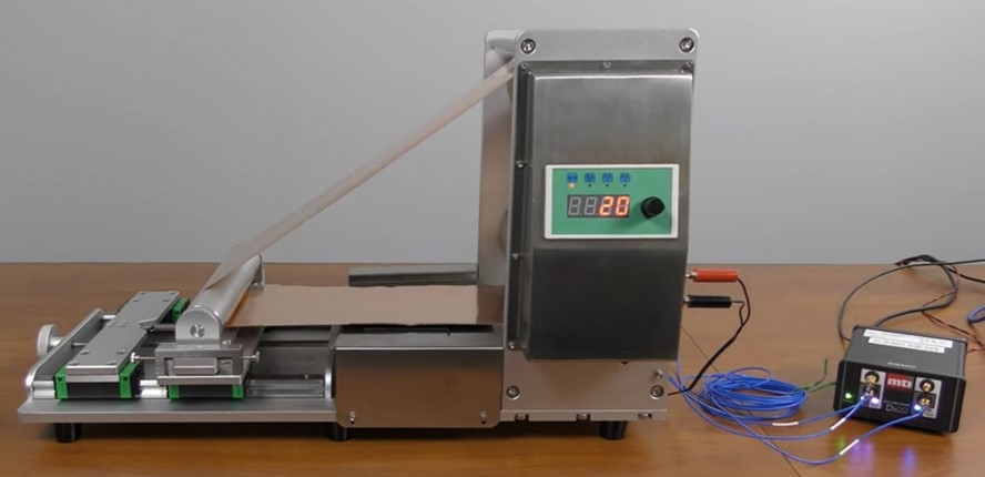 A test rig (Figure 2) was constructed to measure the thickness of copper foil which is typically found in EV battery cathode plates. The EV cathode would be coated with a cobalt graphite mixture. The graphite coating was not used in this testing because it is fragile and easily flakes off during the testing. Previously the system manufacturer has verified that measuring the coating thickness is easily done as the coating is very conductive.