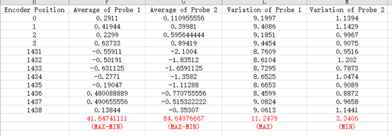 We can also calculate the average and variation of Probe 1 and Probe 3 at each position, from encoder 0 to encoder 1439. Then we get the images shown in Figures 15a and 15b: