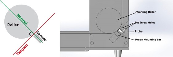 It is important to note that the probes must be mounted normal to the tangent where the foil is flat against the roller. This mounting location is critical to the success of the measurement. Additionally, the working roller should be captured on both sides (box frame) as opposed to a single bearing. This prevents tilt of the roller and further error. The working roller is also conductive and provides a ground return of the foil to the Accumeasure amplifier.