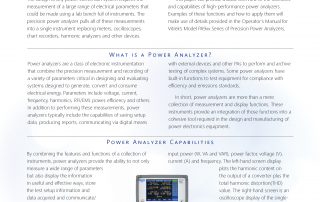 White Paper All the tools needed to study and optimize virtually any power project in a single instrument Introduction The design of any power conversion system requires the measurement of a large range of electrical parameters that could be made using a lab bench full of instruments. The precision power analyzer pulls all of these measurements into a single instrument replacing meters, oscilloscopes, chart recorders, harmonic analyzers and other devices. This paper will provide a basic overview of the functions and capabilities of high-performance power analyzers. Examples of these functions and how to apply [...]