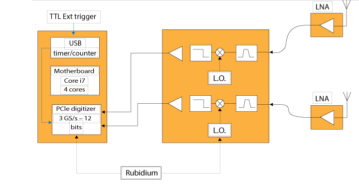The receiver employs a matching downconverter, which is fed by the receive antenna. The downconverter outputs the 800 MHz bandwidth IF @ 750 MHz to the 12 bit, 3 GS/s digitizer input.