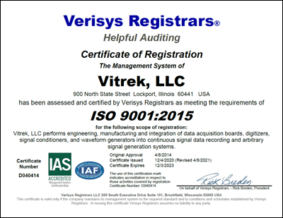 DynamicSignals, a brand of Vitrek, LLC, has been certified in December 2020 by an independent auditing agency, Verisys Registrars, in meeting the requirements of ISO 9001:2015 certification in performing engineering, manufacturing and integration of data acquisition boards, digitizers, signal conditioners, and waveform generators into continuous signal data recording and arbitrary signal generation systems.