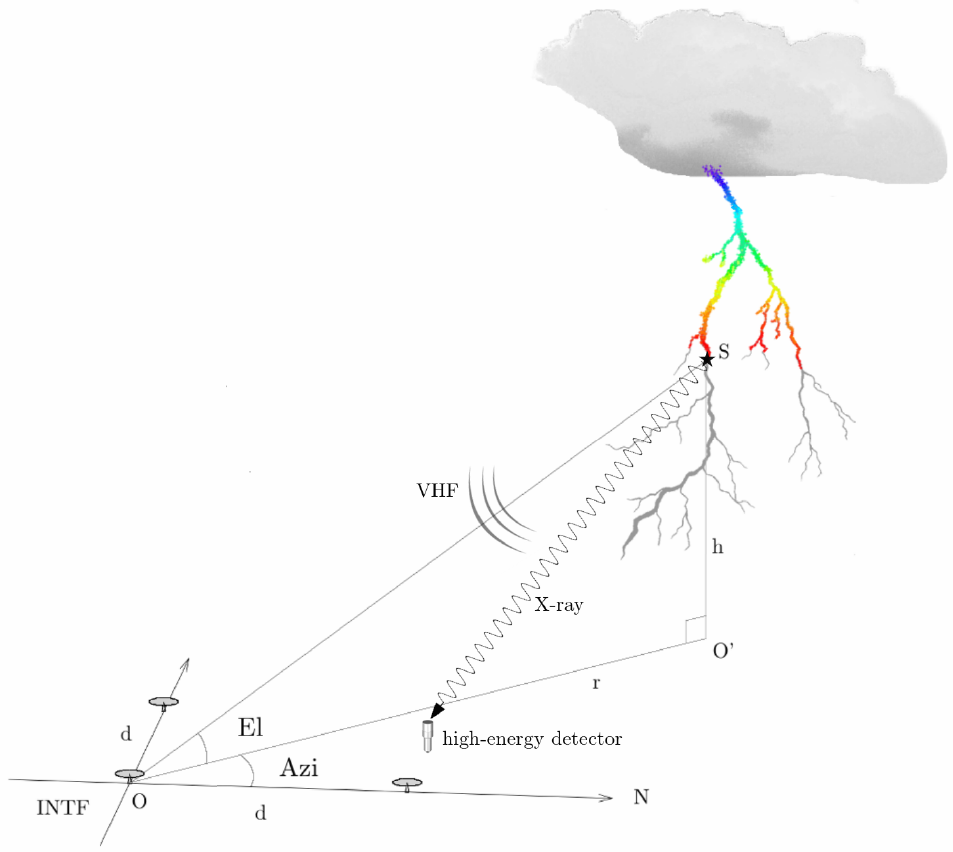 Figure 1: VHF broadband interferometer measurement technique used to map lightning leader propagation while X-ray emissions are captured by a high-energy detector. Three VHF antennas are used (denoted by the oval symbols) for capture.