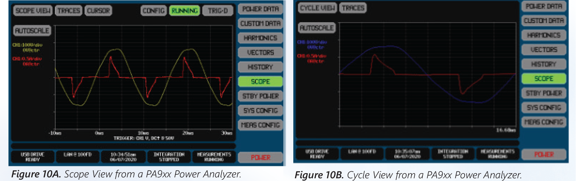 It also provides scope mode and cycle mode screens to display ripple and cycles when calculating LED lighting measurements as seen in Figure 10a & 10b.