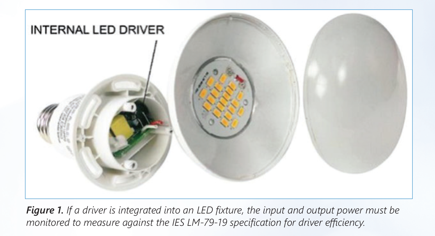 As shown in Figure 1, the LED driver can be integrated into the LED lighting fixture itself. In this case, the input power coming into the luminaire’s LED driver (power supply), as well as its output power, must be measured using test equipment to compute system efficiency (Figure 1.)