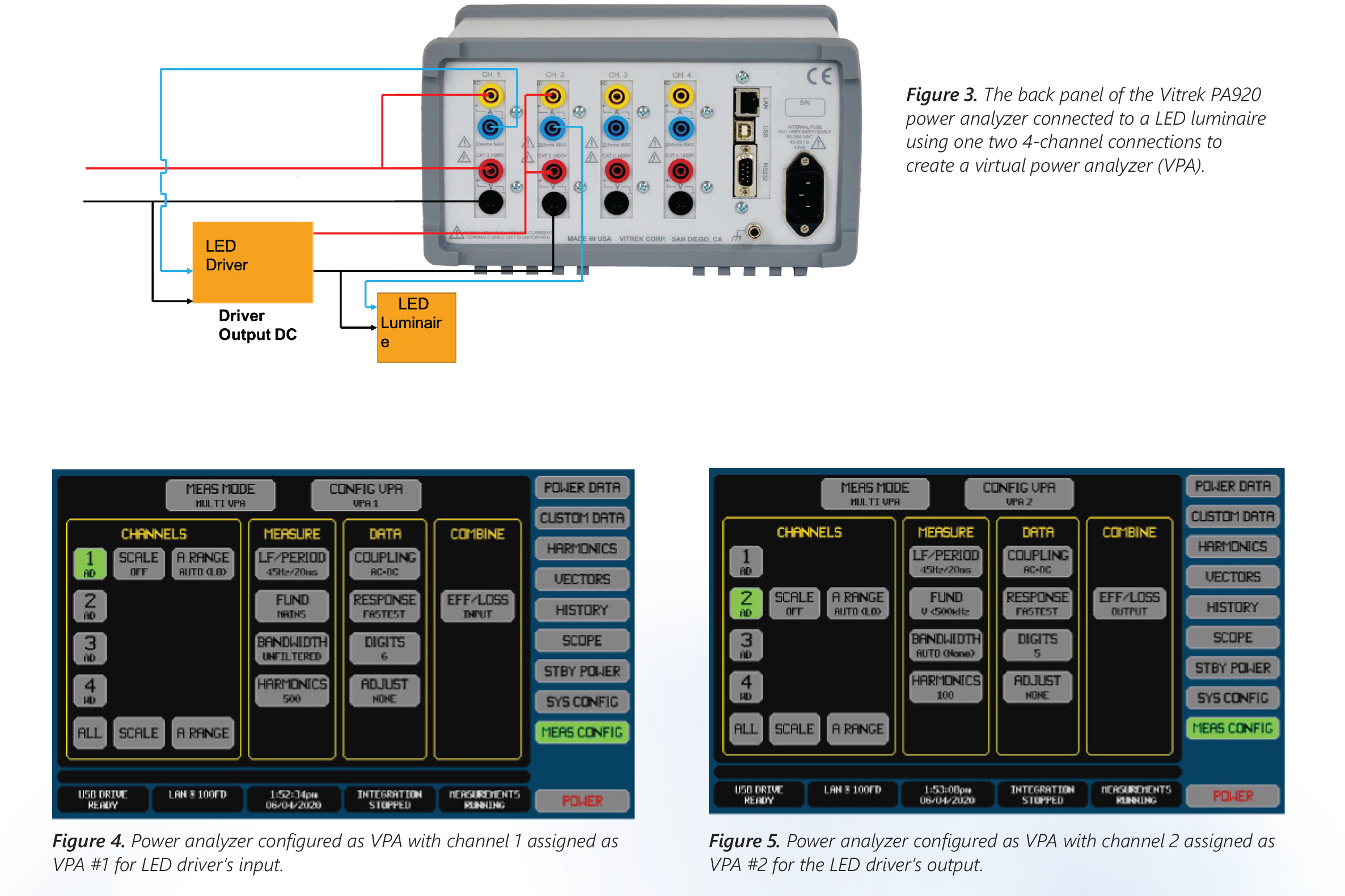 In the following example (Figure 3), the PA is hooked up to a LED Luminaire to test LED driver efficiency to make sure the product meets specifications for compliance. The back panel of the power analyzer in Figure 3 shows two of the channels. On the LED driver side, the input to the LED driver is a 120V AC input signal and output is DC signal (typically around 10 volts.)