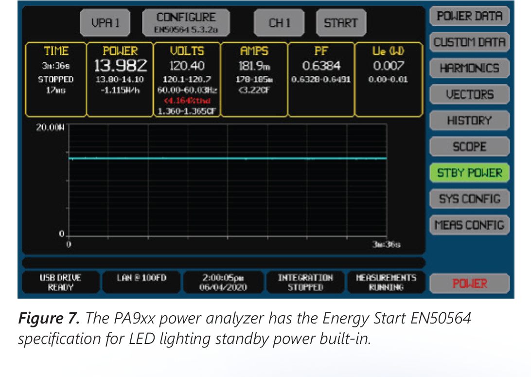 To simplify LED lighting compliance testing, the Vitrek PA9xx family of power analyzers has the portion of Energy Star’s EN50564:2011 5.3.2a specification for standby power built into the unit (Figure 7, in the purple “configure” button at the top of the display). In this example, the analyzer is hooked up to a smart LED lighting fixture. The user can touch the standby power button (right side, in green) hit the power button (bottom, red) and push start to see standby power in volts, etc. displayed on the screen.