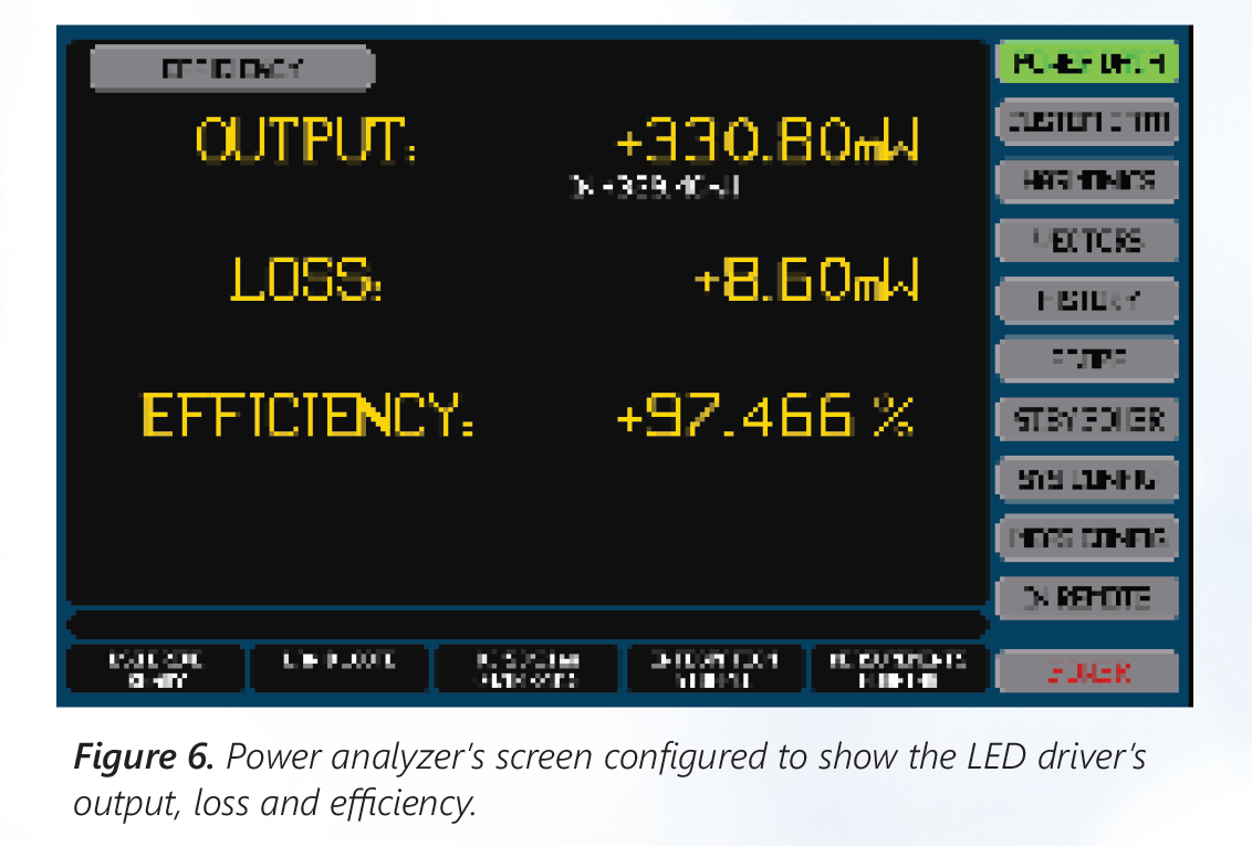 The power analyzer’s power data screen (Figure 2) makes it easy for the user to check to see if LED applications meet all required specifications by showing the following parameters: voltage, current (ripple), power, apparent power (VA), reactive power (VAR), power factor (PF), frequency and efficiency.