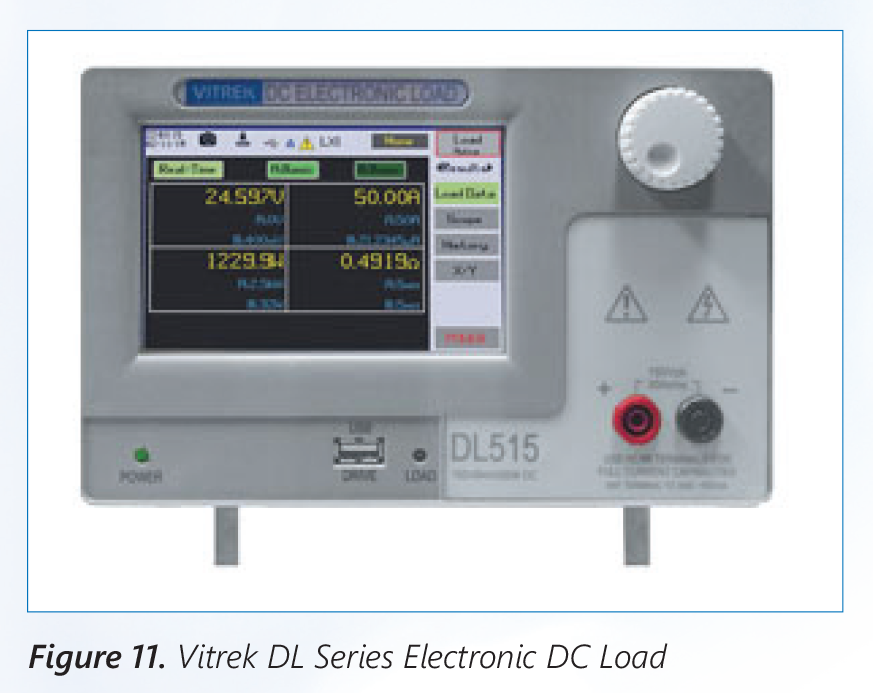 Vitrek’s DL Series Electronic DC Load is used to check performance and energy efficiency parameters for LED lighting during the project’s design and production phases of development. LED drivers, the power supplies for LED lighting applications, need to maintain a constant current even if the load increases. Compact and portable, Vitrek’s programmable DC load (Figure 11) can be used where the LED application is installed to detect if current is stable and luminous intensity (luminous flux) stays within reason even if the load changes. The DL Series Electronic DC Load is available in six different models with three different voltages and wattage levels.