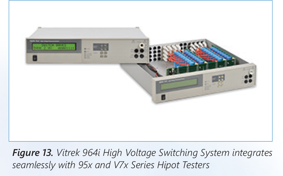 Vitrek’s 964i high voltage switching system (Figure 13), can be used with the Vitrek V7x and 95x series hipot testers during the final test phase of product production.