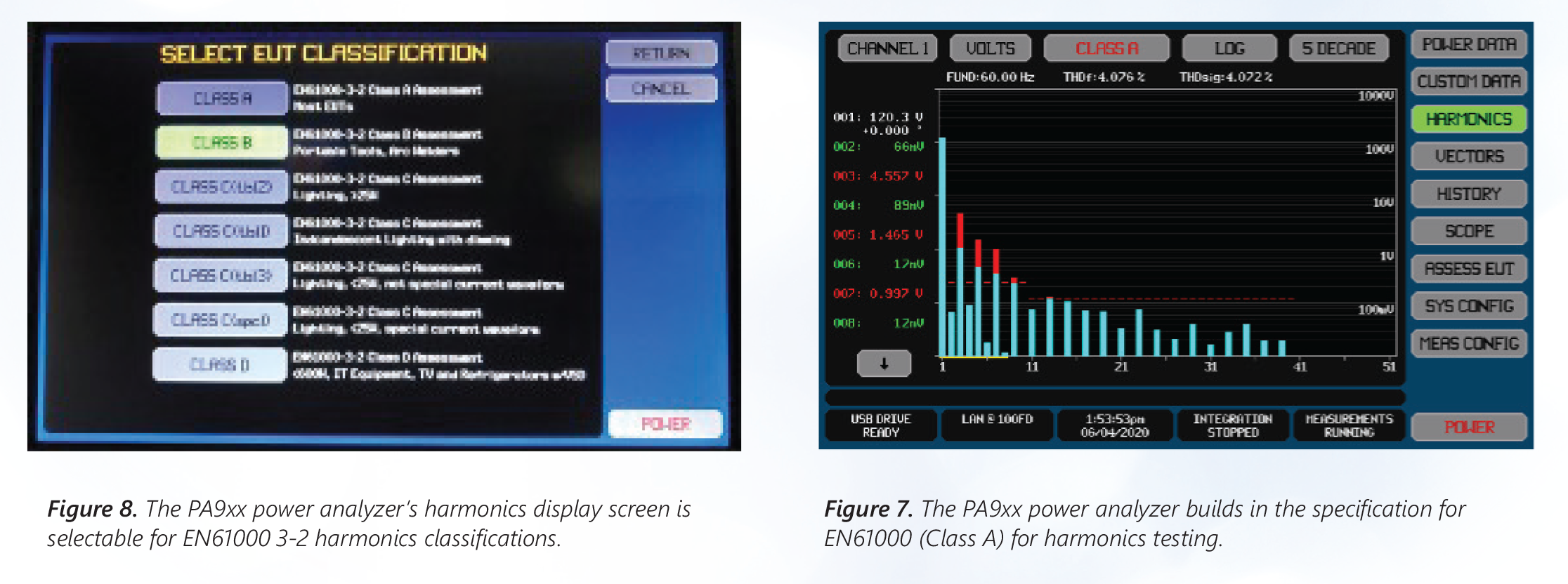 Similar to the standby power feature, the PA9xx family of power analyzers also have the AEN61000-3-2 and 4-7 specifications for harmonics built into the units. It allows the user to select which classification of EN61000 3-2 is displayed (Figure 8). As shown in Figure 9, the red “tick” marks on the harmonics screens indicate that the LED lighting device is failing the harmonics testing for the required Class A harmonics levels.