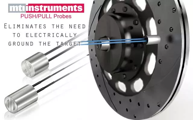MTII offers a unique push-pull capacitance sensor which eliminates the need to electrically ground the rotor. This novel approach uses two sensing elements built into one probe body that work together to complete the measurement circuit. The push/pull probe design provides a clean and consistent electrical path resulting in decreased noise, higher accuracy and significantly more stable and repeatable measurements. Highly resistive targets can be measured with this technology allowing capacitance sensors to be used on semi-insulating and semi-conducting targets. The push/pull sensor design cancels common mode noise encountered in magnetic bearing surfaces, semiconductor wafers, brake rotors and air bearing floating surfaces.