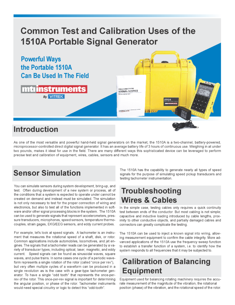 The 1510A is uniquely designed to simulate all of the common types of vibration and speed sensors. The dual outputs of the 1510A can simulate a speed sensor, a vibration sensor, and the phase simultaneously. The 1510A output range is 0-100kHz, allowing it to simulate speed signals for large and small turbofan engines, APUs, turbochargers, pumps, compressors, and other rotating machinery. The 1510A can even simulate odd-tooth type tachometer signals that are commonly found in gas turbine engines and charge-mode sensors such as piezoelectric accelerometers.