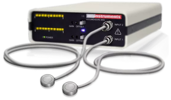 Since two channels were needed, to adjust both sides at once, MTI recommended the Accumeasure 9000 dual channel amplifier. The system integrator added a data acquisition system and wrote a program that indicated the gap visually to an assembler, so the sliding rod height could be quickly and accurately adjusted.