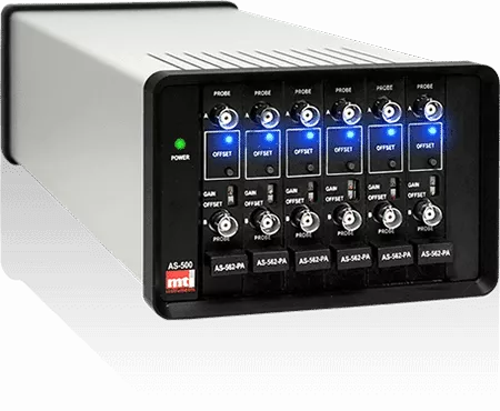 If more than one measurement is required on a single target the amplifiers should be synchronized to reduce possible interference. Synchronization is accomplished by making sure the oscillators that drive the electronics are in phase. When out of phase, “beat” frequencies may be seen on the sensor outputs. This is not a problem when the number of measurement points can be satisfied with one chassis (such as the dual channel Accumeasure 9000 or the multi-channel systems: Accumeasure 1500 or Accumeasure 500) because all capacitance amplifiers are driven by the same oscillator. If more than one chassis is required, one chassis should act as a master, causing the others to be synchronized “slaves”. MTI’s Accumeasure line of sensors has provisions to configure any amplifier as a master or a slave.