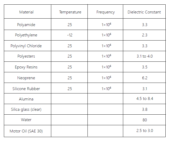 Dielectric materials are those materials which behave more like insulators than conductors. The following is a list of dielectric constant for some common plastics, rubber, glasses and liquids:
