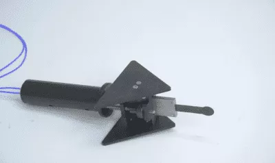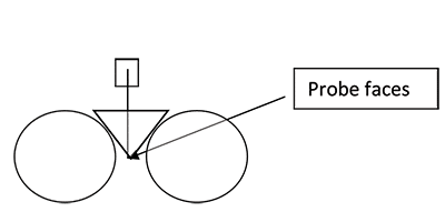 Figure 5. Gap monitoring wand inserted between rollers; capacitance probes are tangent to both roller faces. An adjustable plastic roller stops aids with depth of insertion.