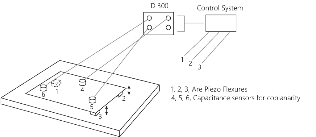 Gap measurements are processed by a D-300 Digital Accumeasure capacitive amplifier. The amplifier interfaces with the control system via 1000 base Ethernet or USB to monitor coplanarity and provide position control to the actuators. The amplifier and control system generate a 1,000 points/sec sample rate of the planar position.