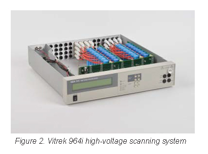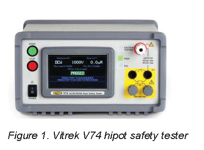 Vitrek addresses product safety in a variety of application areas. Its products can test medical equipment, consumer appliances, communication equipment and lighting while also finding use in industrial, aerospace and automotive applications, according to Kevin Clark, president. “Vitrek offers two series of electrical safety testers — 95x and V7x (figure 1) — that each perform hipot tests as well as insulation resistance (megohms), ground-resistance (milliohms) and ground-bond tests,” he said. “The product line also includes the 964i high voltage switching system for multi-conductor applications (figure 2.)